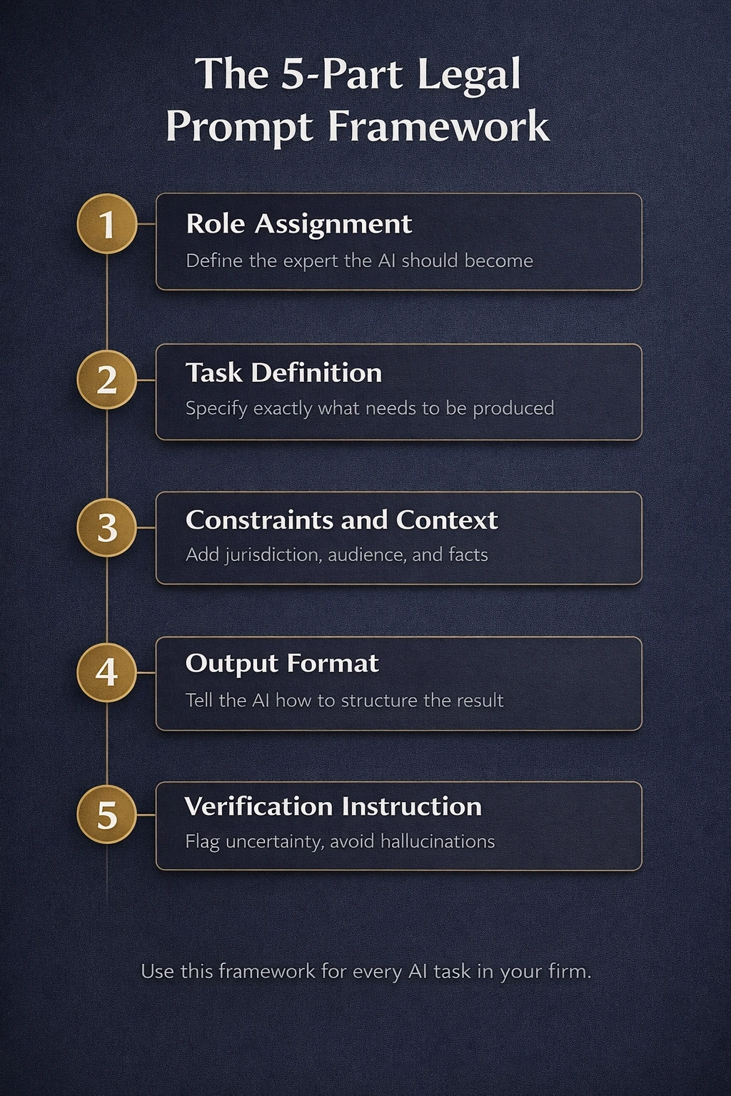 Effective legal prompts share a consistent structure. Whether you're drafting a contract, summarizing a deposition, or preparing a client update, the best prompts follow this five-part framework.