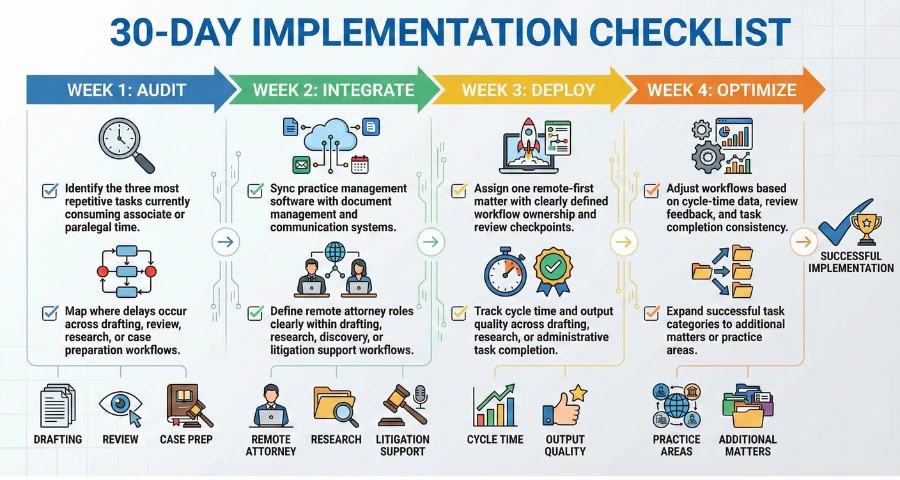 Most firms can pilot a virtual workflow within 30 days by automating intake, integrating tools, and deploying remote attorneys on defined matters.