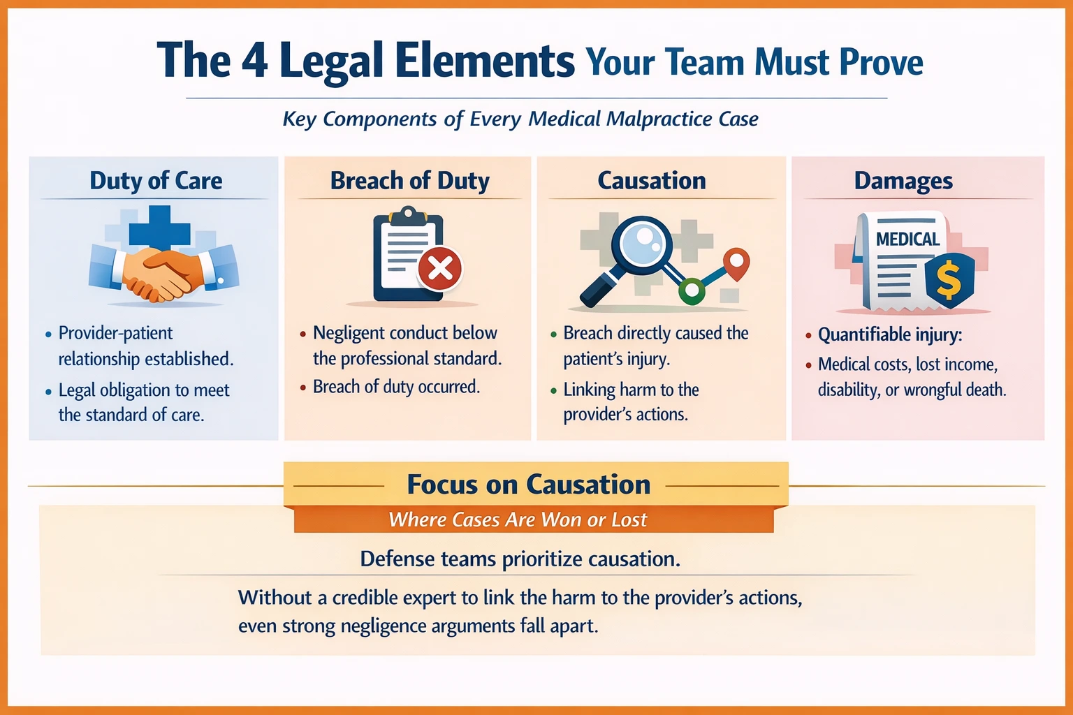 Every medical malpractice case rests on four elements. Your attorneys and paralegals need to approach each file with these as the organizing framework from intake forward.
