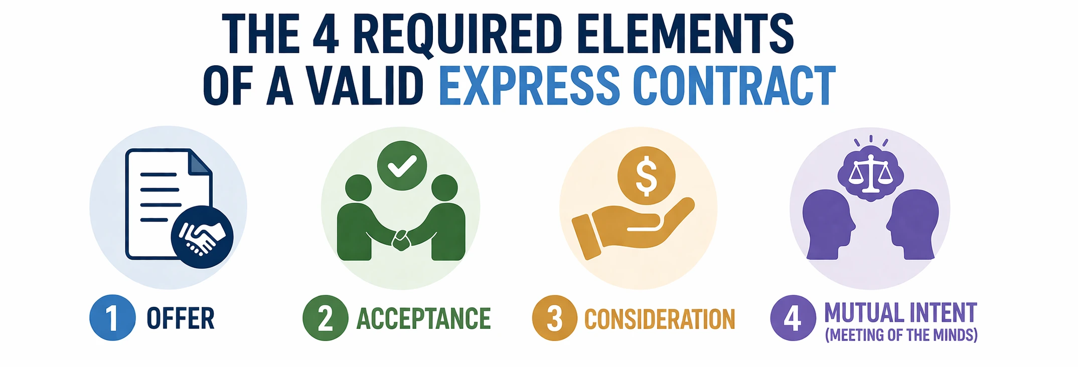 An express contract is an agreement where both parties state their terms clearly and agree to be bound by them. Nothing is assumed. Nothing is inferred from behavior. The terms are said out loud or put in writing, and both parties understand those terms create legal obligations.